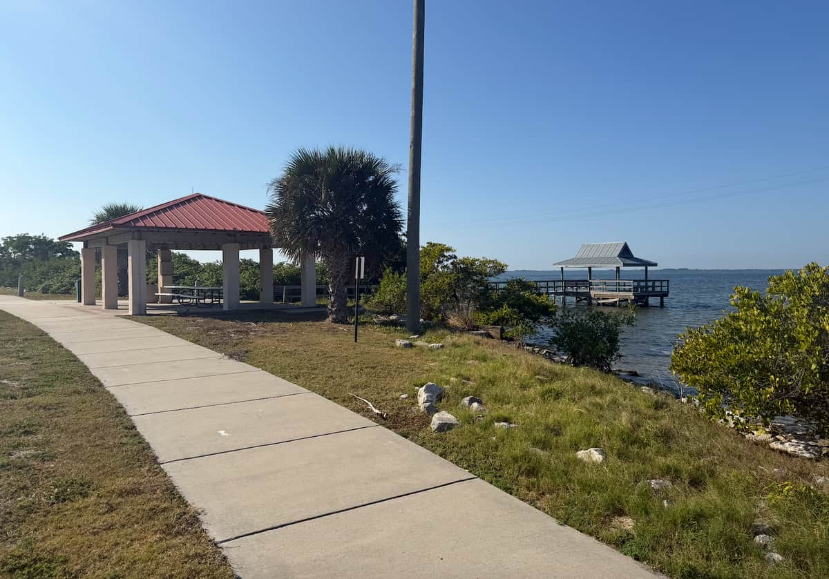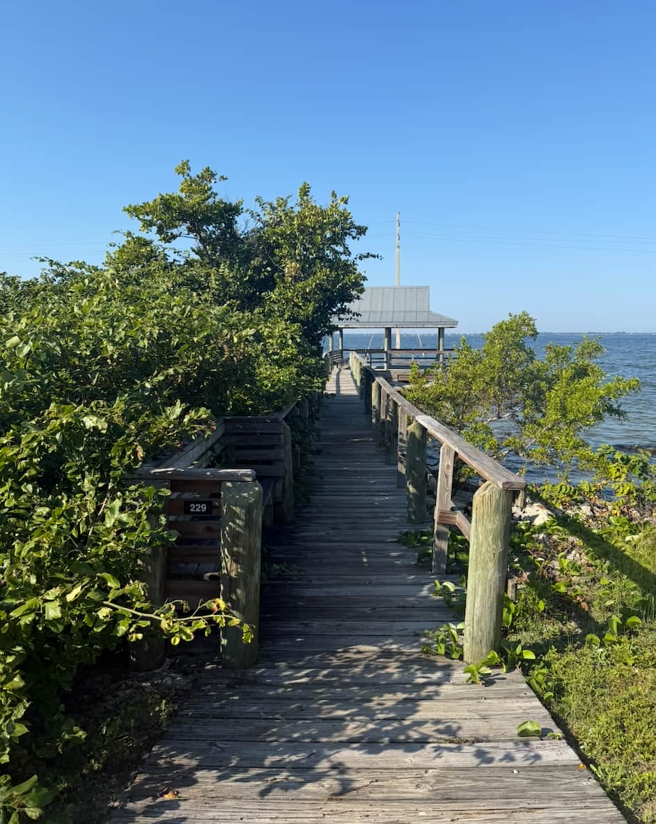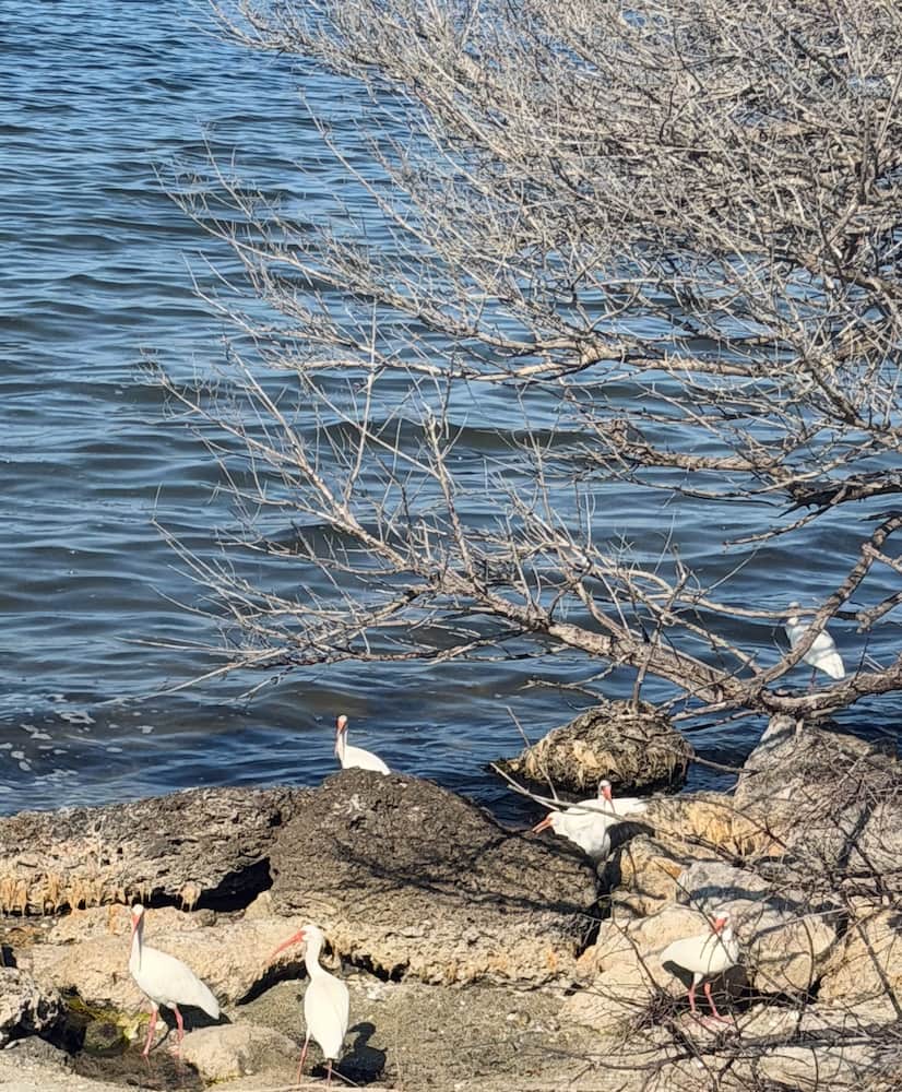 For all of the stories of storms and waves the size of buildings, I expect is was conditions like this that lured people to go to sea. I am land lubbing this morning - out for a run a loop that while conveniently made of concrete for skateboarders and moms pushing carriages is brutal on knees. That left me jogging alongside in the grass looking down more for ankle-eating holes than looking up. The neighborhood offers picnic and fishing piers every half mile or so, making good places to stop and smell the roses…or the fish, as the case may be . There are plenty of ibises around happy about the latter.