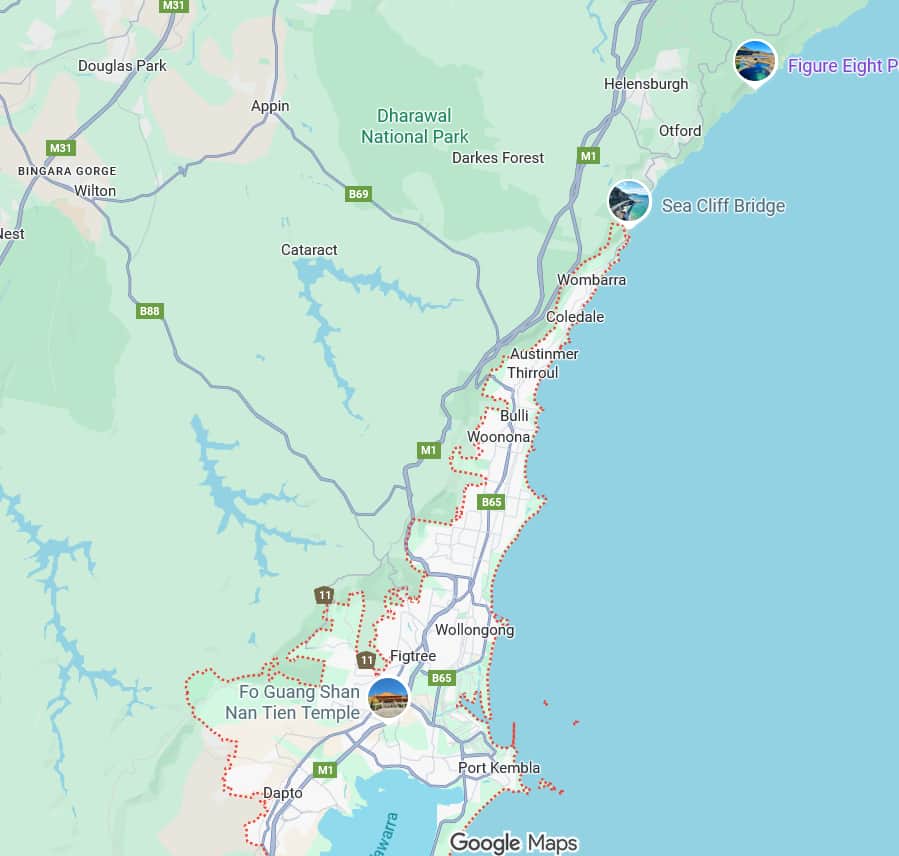 The trip from Coalcliff to Clifton went from about a minute to nearly an hour. Wollongong is a narrow strip of land between the ocean and the escarpment stretching from Helensburg to Yallah.