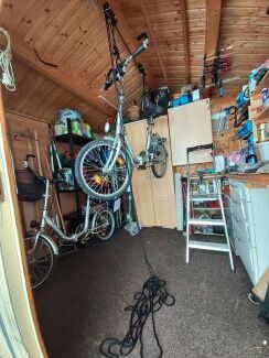 At first I wanted to go for a mounting stand that bike shops have but I’d still have to lift the bike to fix it. Then I came across this kind of bike lift with pulley which enables you to lift the bike from the ground, even heavier models like e-bikes and I had a free ridgepole so that I could work indoors… That was critical. Meanwhile I adjusted the rope which was made for ceilings of up to four metres.