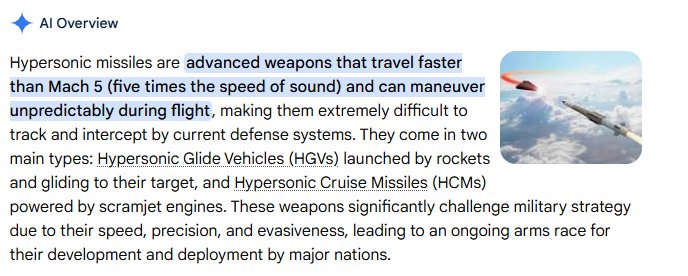 Please, ignore this distraction. Certainly these weapons exist, certainly they can pose a threat. That is not in question. The issue is that suddenly some are portraying them as an immediate and massive threat … but not so much a year or two ago. What has changed? Not the weaposn nor the threat. What has changed is Trump’s crazy idea to take over Greenland (and a need to find any justification) and Trump’s need for crazy distractions. Hence Davey (I love Trmup) J post. Distraction from the actual immediate and massive threat.