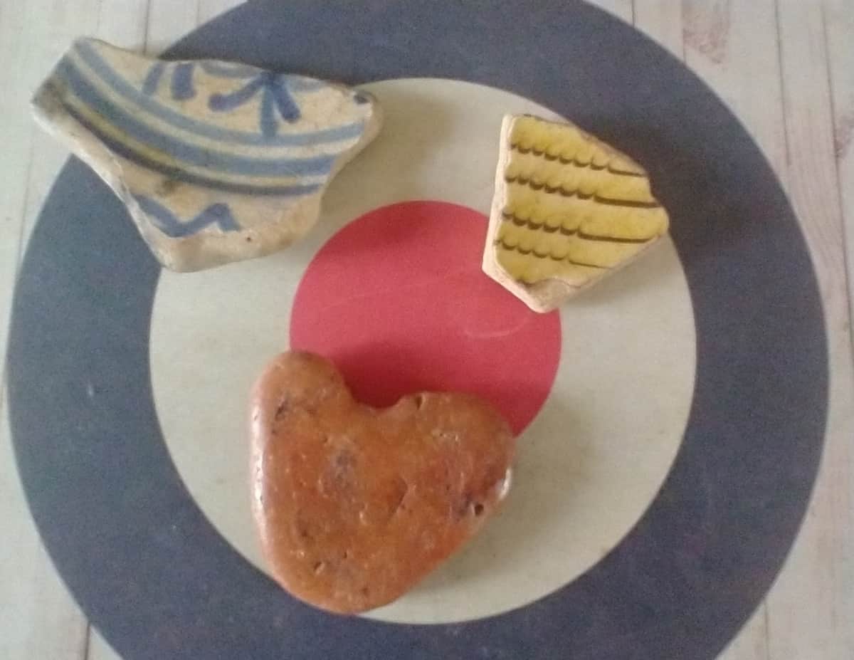 A piece of London Delft, tan combed slipware and what was once a medieval possibly Roman roof tile. You can see where the rather hefty nail would have gone in at the top.